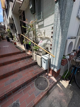 玄関までのアプローチに屋外用の手摺を付ければ、ちょっとした坂でも安心です。